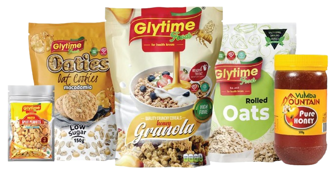 Glytime Foods product range — Oaties, Granola, Rolled Oats, Vumba Mountain Honey